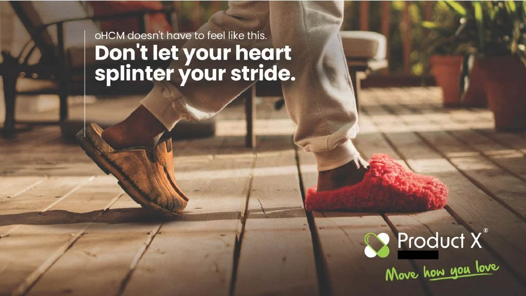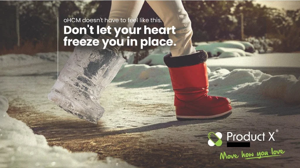 The heart medication, referred to as Product X, aims to relieve symptoms of obstructive hypertrophic cardiomyopathy, or oHCM. My background in science research was especially advantage as I researched the biology of oHCM and lived experiences of patients with the disease. The disease causes fatigue, shortness of breath, and chest pain, especially during activity. The medication we were advertising intends to facilitate greater physical mobility, so my editorial team and I came up with the tagline: