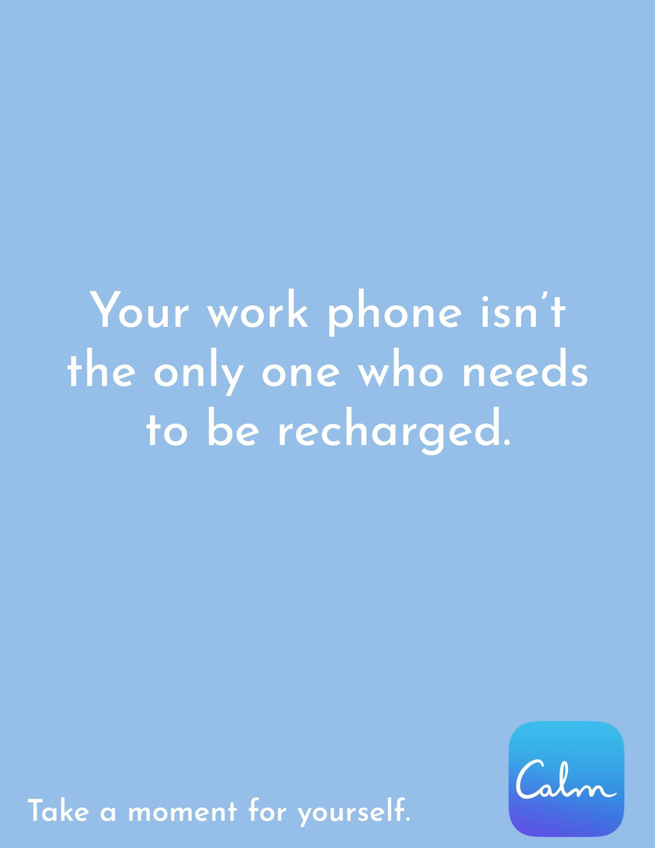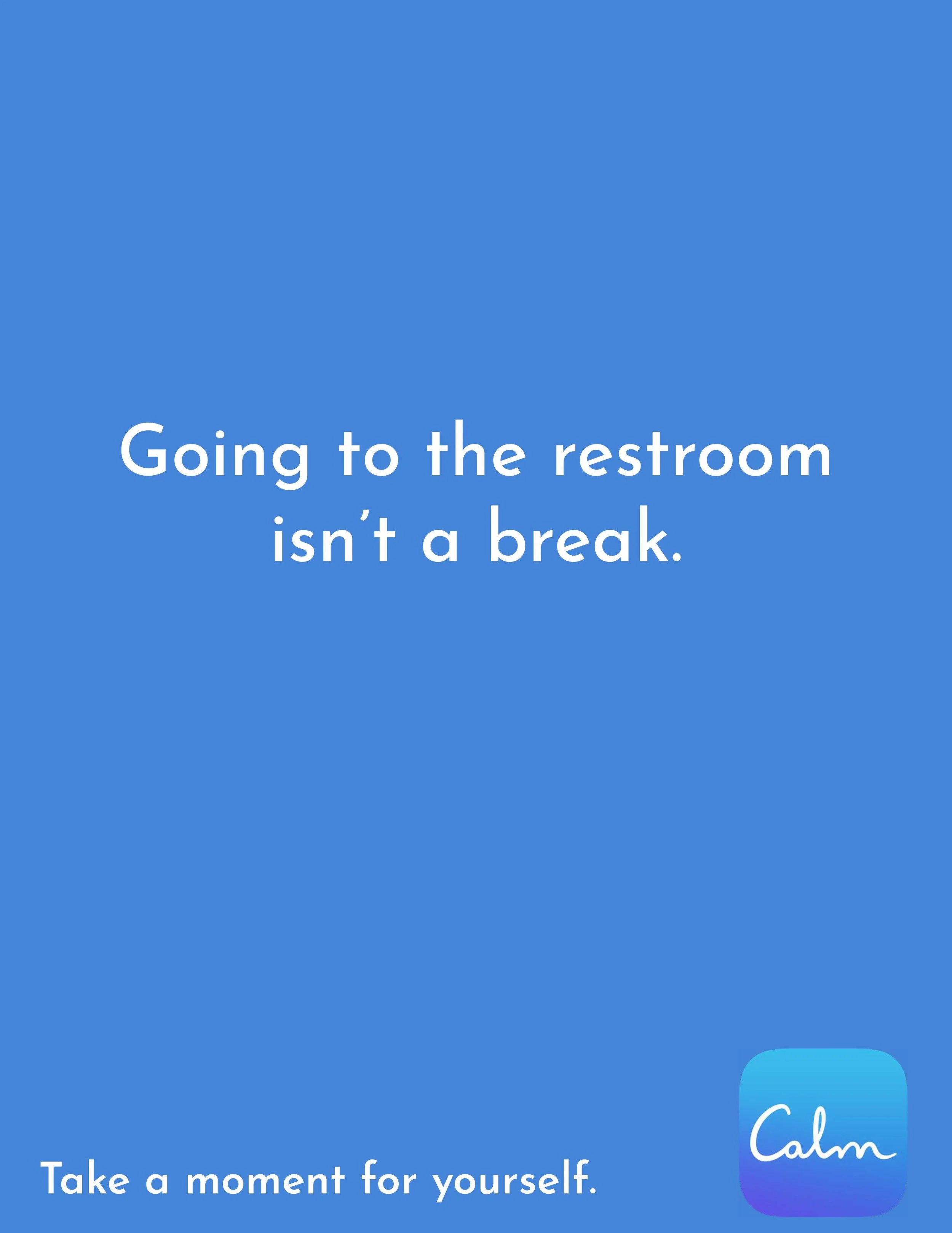 Ads 1 and 2 refer to familiar work tools that can remind workers about well-being. Ad 4 illuminates the incongruence in thinking about work while off the clock. Ads 3 and 5 discuss time. Calm has workplace videos as short as 60 seconds, an achievable amount of time to spare. A work break doesn’t have to take long, but it also needs to be an intentional mind reset — and not a necessary act like going to the restroom.
